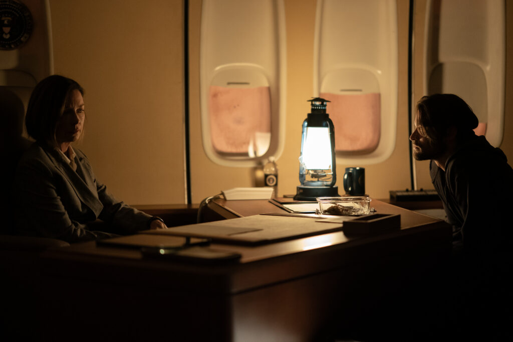 Sinatra and Link sit down to chat aboard Air Force 1. Link mentions that he is 26 years old and tells her that he is leading a total of 10,000 people. He tells her that they can tell they’re running the bunker off of 3-5 nuclear reactors and that they want one to restart the world. Sinatra tells him that they don’t have one to spare. From the apple pie slice, he can tell that they have greenhouses, agriculture, refrigeration, etc. Then he drops “I’m here for Alex.” UMM WHAT.