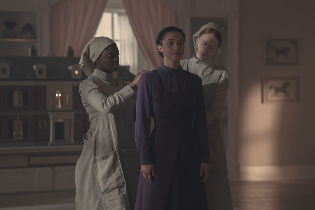 THE TESTAMENTS – “Precious Flowers” – In the halls of Aunt Lydia’s premarital preparatory academy, the finest in Gilead, Agnes is assigned to mentor a new Pearl Girl, and a fragile alliance begins. (Disney/Russ Martin) BLESSING ADEDIJO, CHASE INFINITI, KIRA GULOIEN