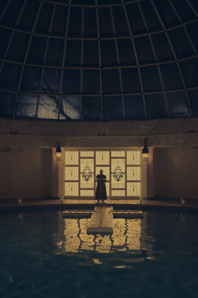 In the middle of the night, a dark figure wakes her, and it is Aunt Lydia who says “It’s time.” She puts a green cloak over Agnes’s nightgown, and they take a ride over to the school where candles light the way to a large baptismal pool. The pool is surrounded by green hooded figures. Aunt Lydia beings to recite lines and it’s clear that this is some sort of initiation or baptism into womanhood.
