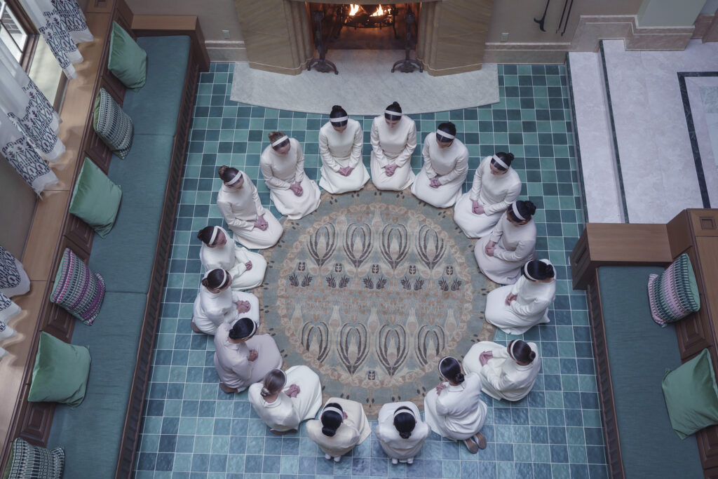 THE TESTAMENTS – “Precious Flowers” – In the halls of Aunt Lydia’s premarital preparatory academy, the finest in Gilead, Agnes is assigned to mentor a new Pearl Girl, and a fragile alliance begins. (Disney/Russ Martin) ROWAN BLANCHARD, MATTEA CONFORTI, CHASE INFINITI, LUCY HALLIDAY, ISOLDE ARDIES
