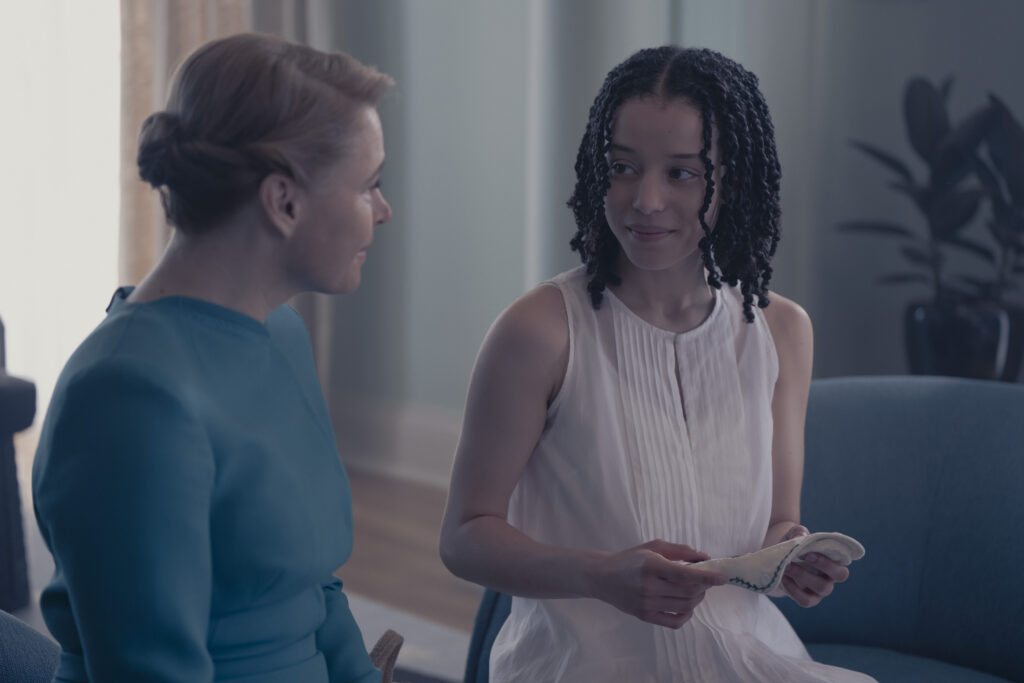We pick up immediately where we left off in Agnes’s bathroom as she contemplates this new stage of her life in Gilead now that she’s begun menstruating. She’s both ecstatic and scared to death. We don’t know all of what these young girls have been told about what happens next in terms of their bodies. Paula finds Agnes walking around with her blood stained clothing. She kneels before Paula and recites a prescribed set of lines to announce her menarche. Paula goes to get some pads and beings to teach Agnes about how to care for her period and takes a genuine moment to help her through this phase of life. She also gives Agnes a cover for her pad that her mother Tabitha made her before she died. Agnes flashes back  to a moment with Tabitha where she tells her a fairytale version of the story of how she became her mother.